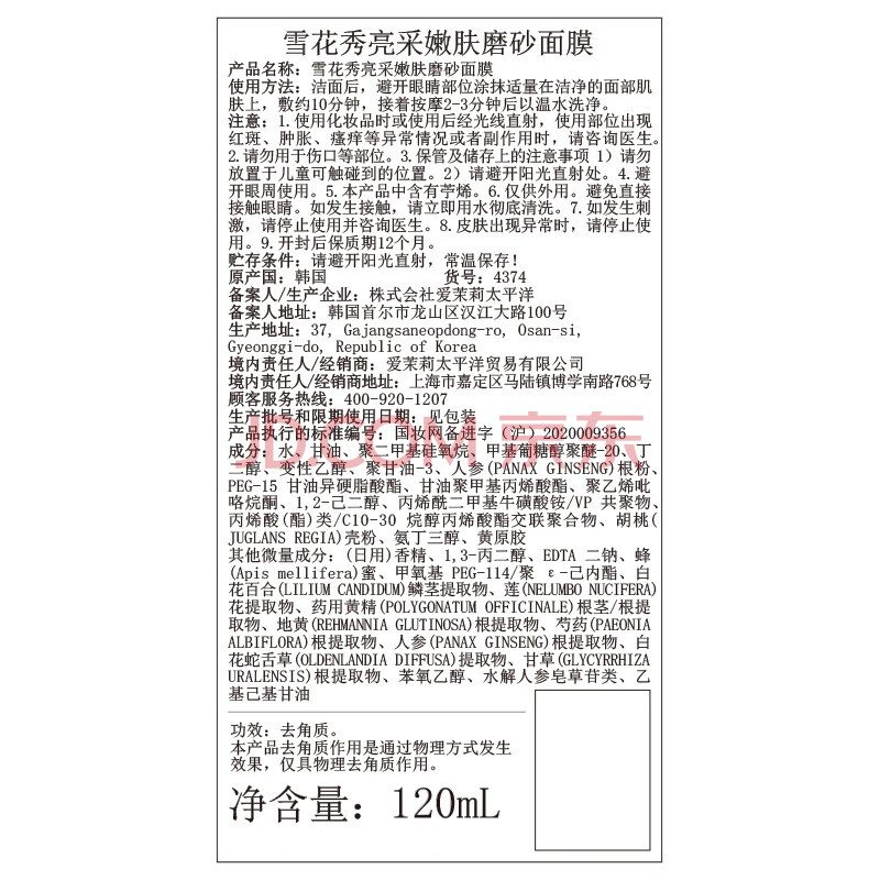 商品相册:雪花秀亮采嫩肤白参磨砂面膜120ml 润养焕亮水洗式清洁送女友礼物第