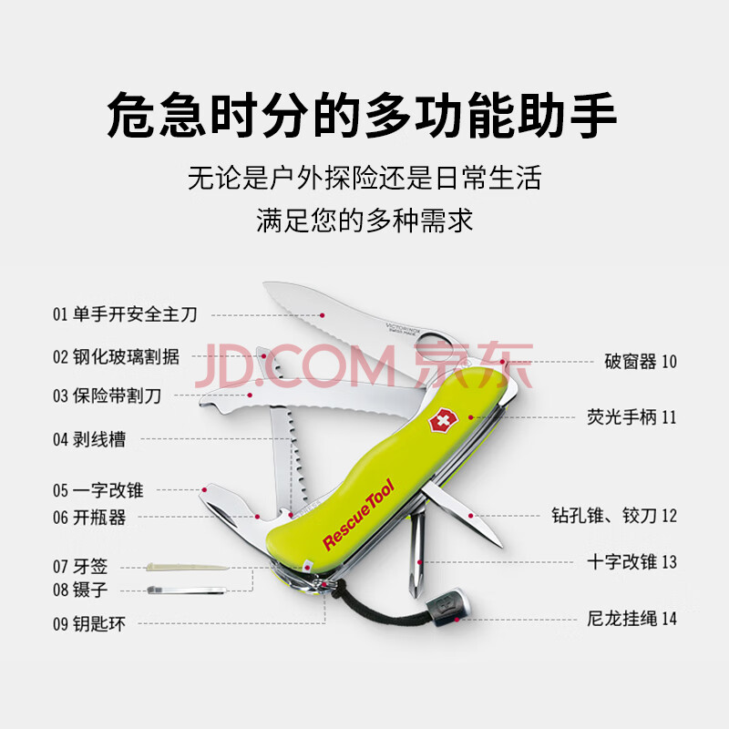 商品相册:维氏瑞士军刀救援工具14项多功能水果刀刀折叠刀荧光黄0.8623.MWN第1张/共9