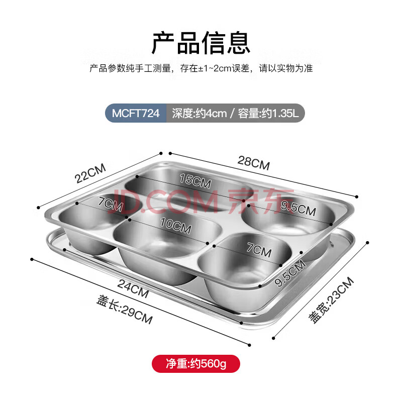 商品相册:美厨(maxcook)304不锈钢餐盘饭盒 5格加深加厚分格带盖快餐盘学生餐盒MCFT724第