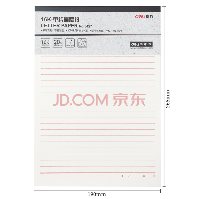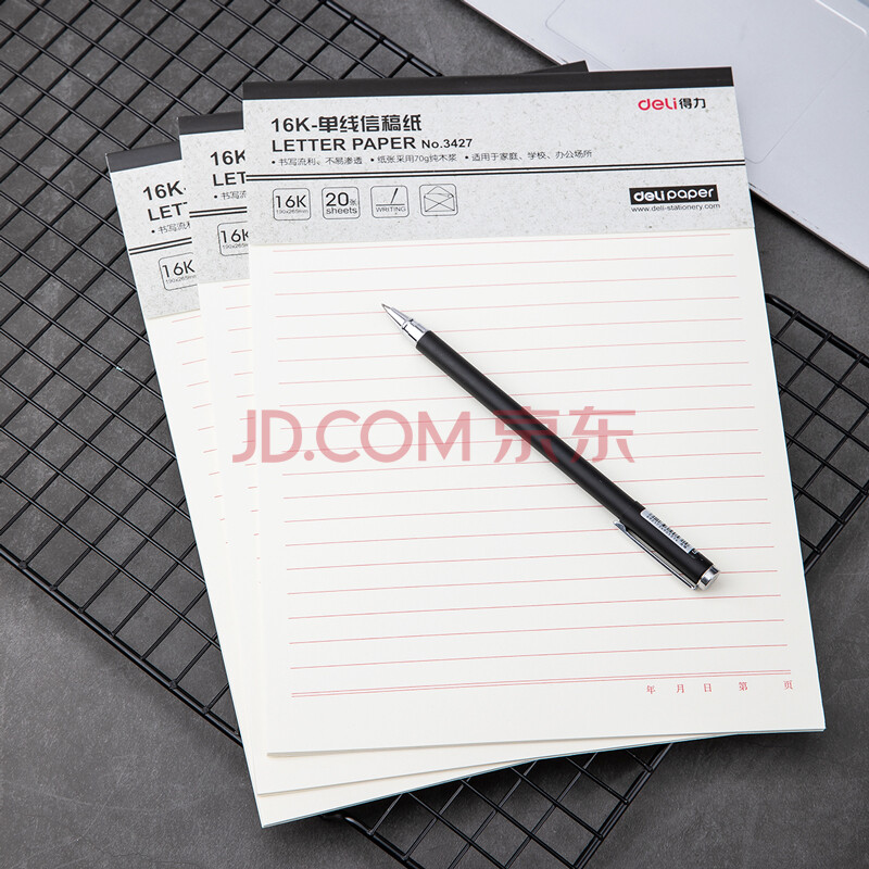 商品相册:得力(deli)3427 16K/20张单线信纸信签纸信稿纸 申请书稿专用纸 笔记信签作文纸草稿纸-70g-266*190mm 3本装第