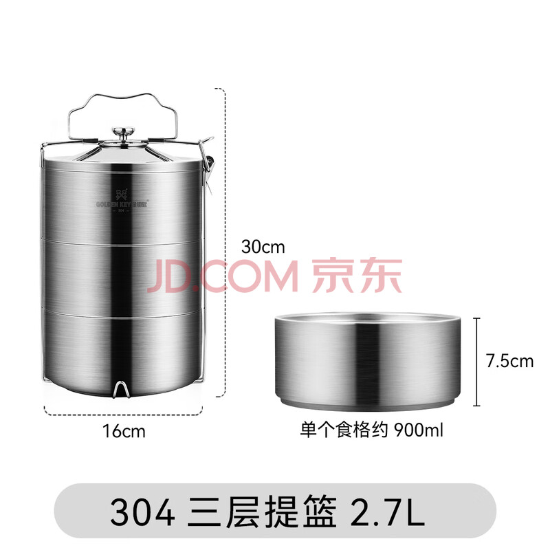 商品相册:金钥匙(GOLDEN KEY)304不锈钢至尚2.7L三层保温饭盒提篮分层便当盒GK-TL2700-3第