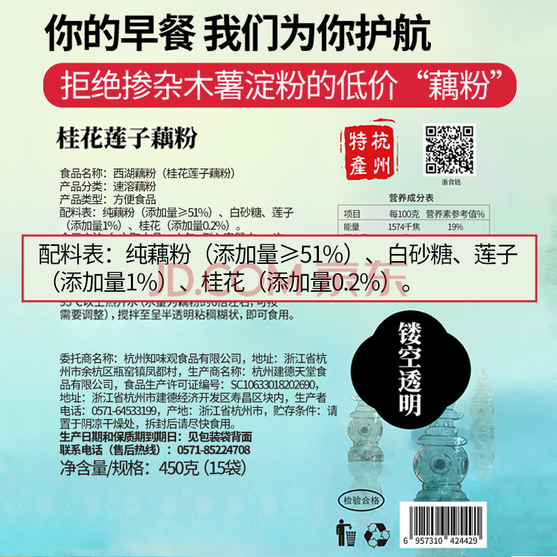 商品相册:知味观西湖桂花莲子藕粉速溶 中华老字号杭州特产 早餐代餐冲饮450g第