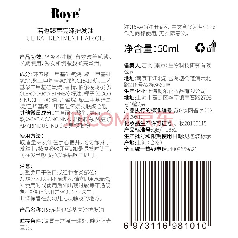 商品相册:roye若也【龚俊同款】护发精油隔热护色免洗顺滑亮泽防毛躁烫染50ml第