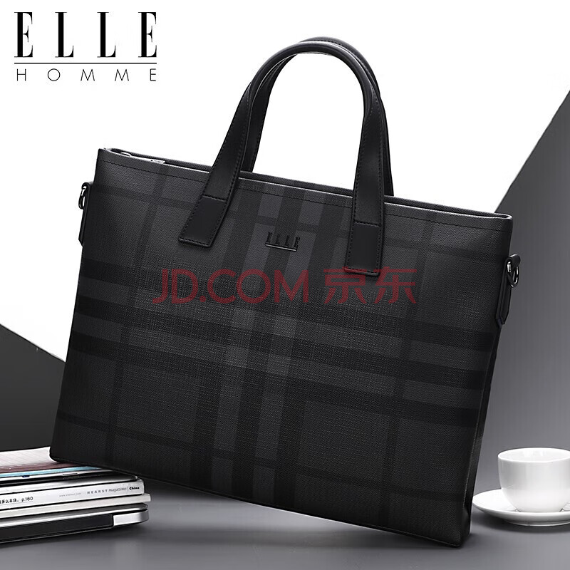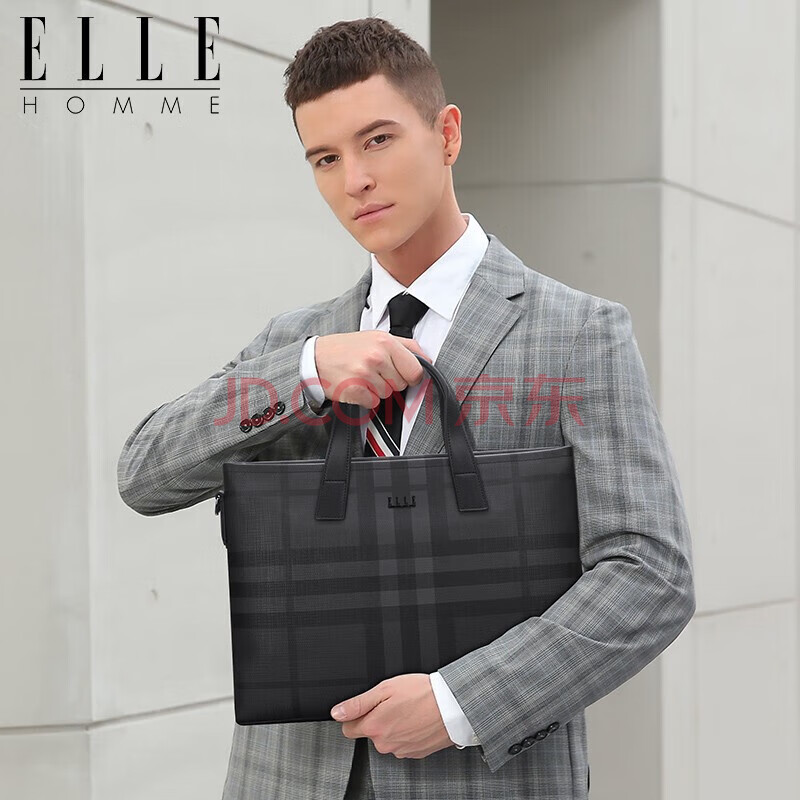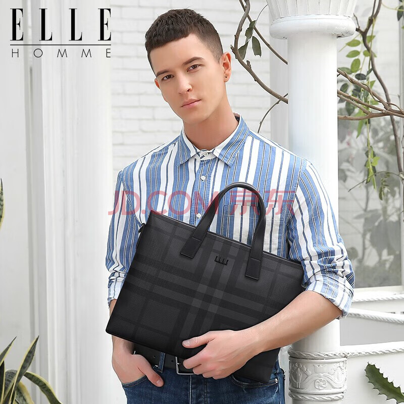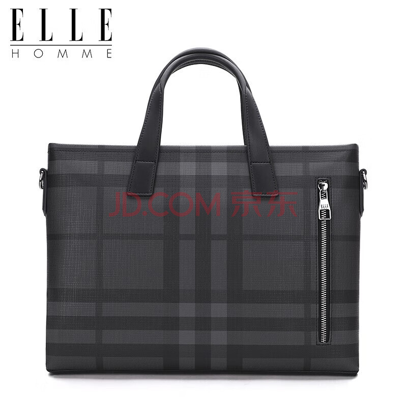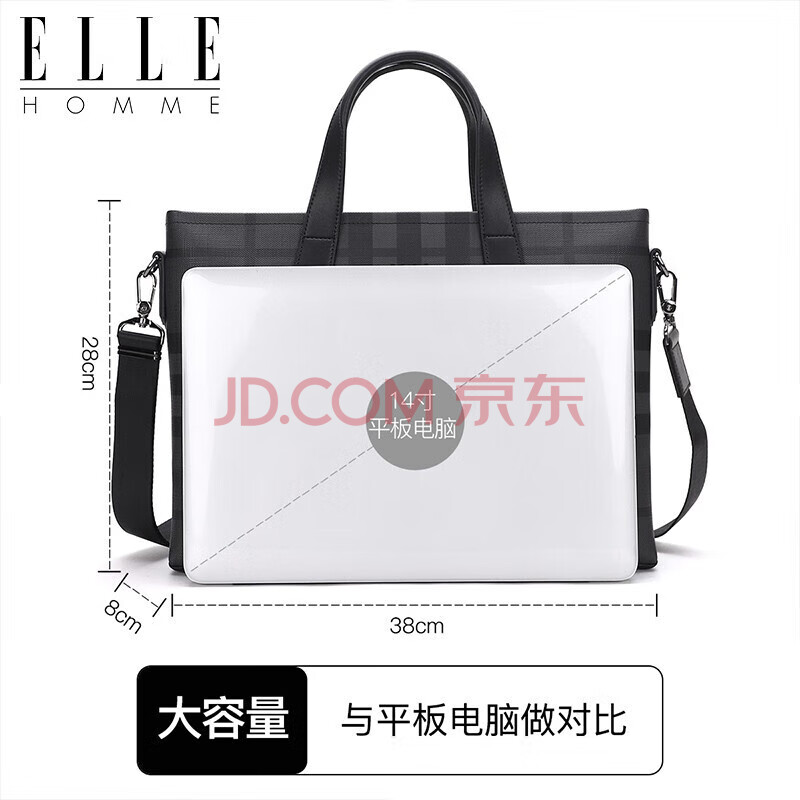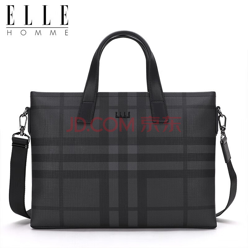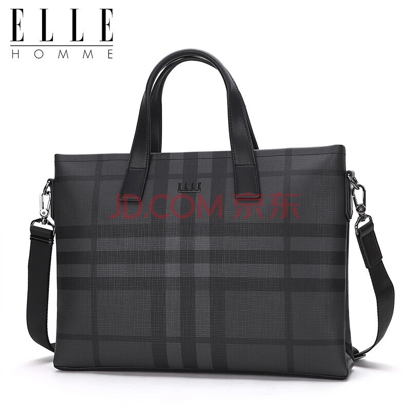 商品相册:ELLE HOMME男士公文包 时尚条纹撞色手提包大容量PVC配皮单肩斜跨包14英寸电脑包EA188211211黑灰第