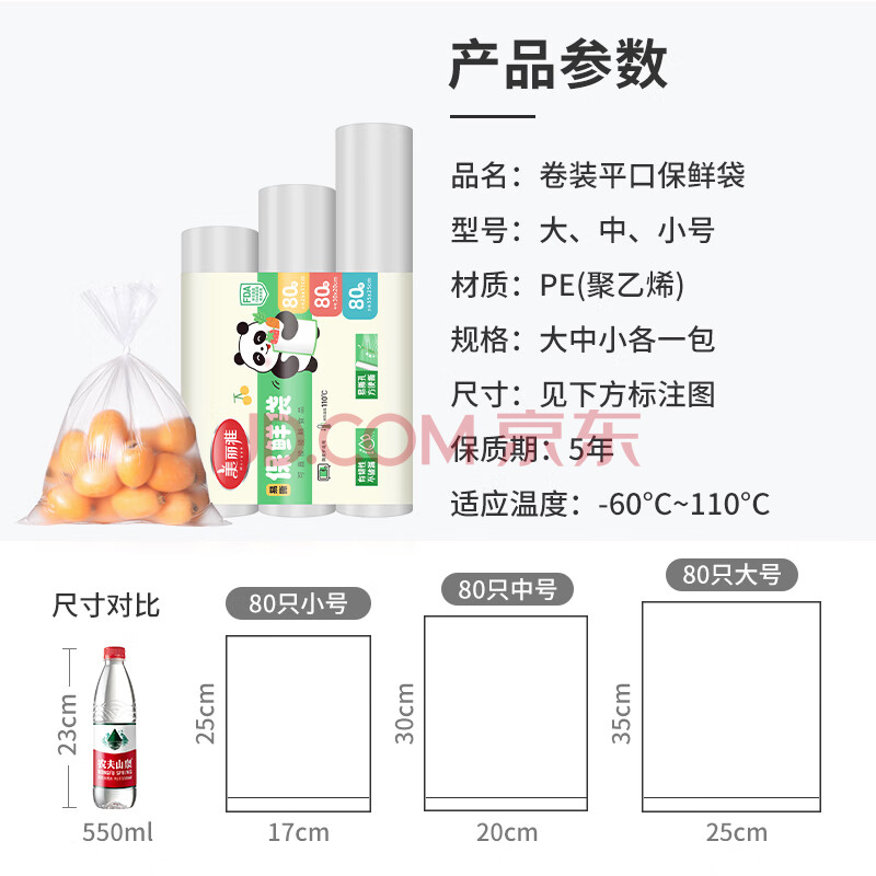 商品相册:美丽雅食品级保鲜袋240只 一次性塑料打包袋大中小号各80只可微波第