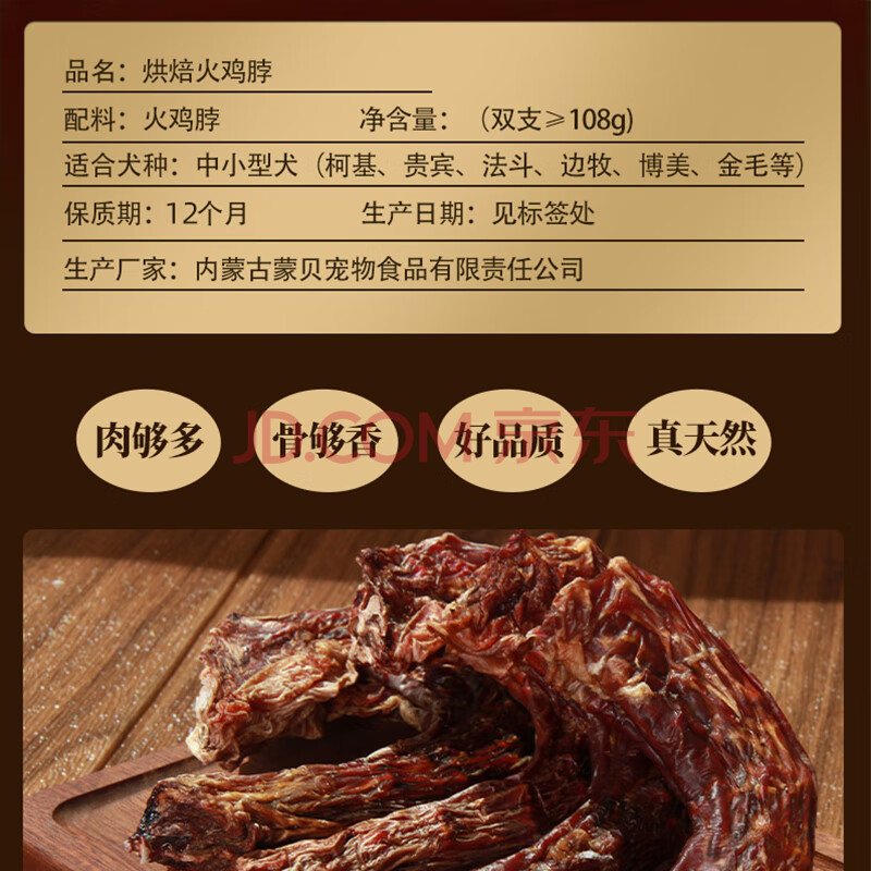 商品相册:蒙贝 风干火鸡脖 狗狗零食 磨牙棒洁齿骨训犬奖励 108g共2支第