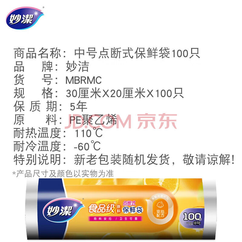 商品相册:妙洁中号保鲜袋100只 点断式塑料食品袋子厨房超市第