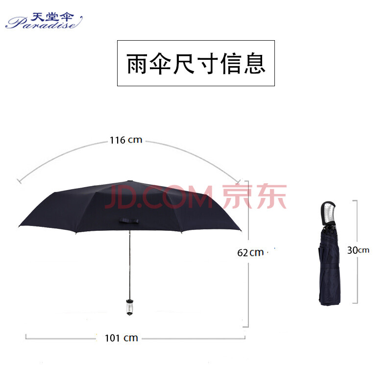 商品相册:天堂伞 自动伞三折自开收黑胶晴雨伞防紫外线经典商务伞太阳伞遮阳伞58cm*8骨 3331E碰升级款 藏青色第1张/共4