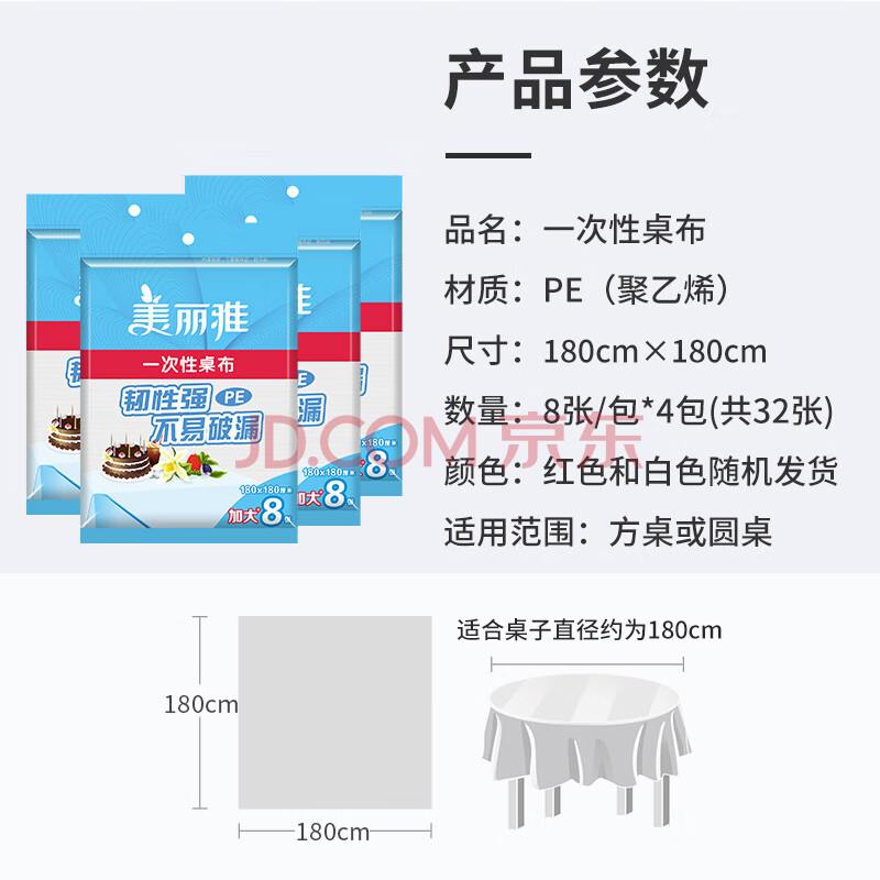 商品相册:美丽雅一次性桌布防水防油加厚正方圆餐桌野餐露营塑料大号台布32张第