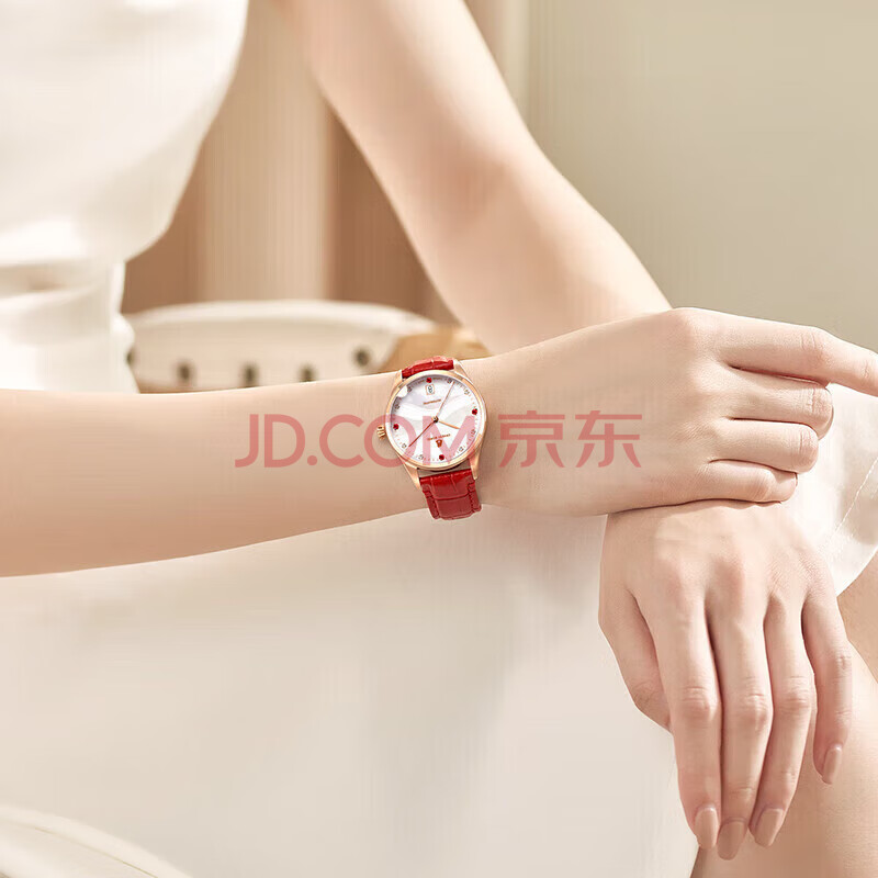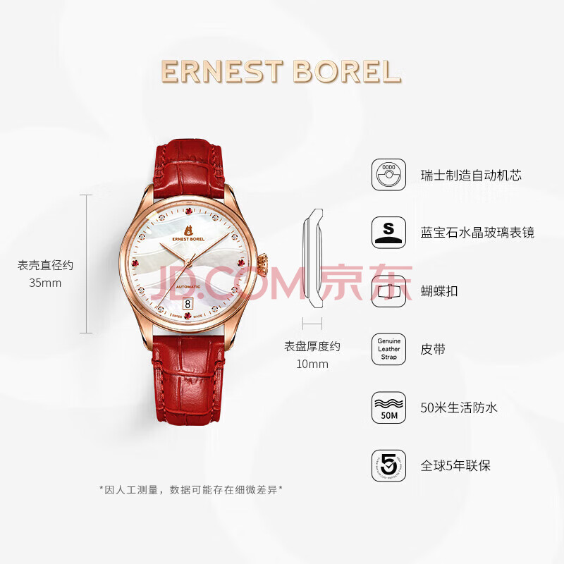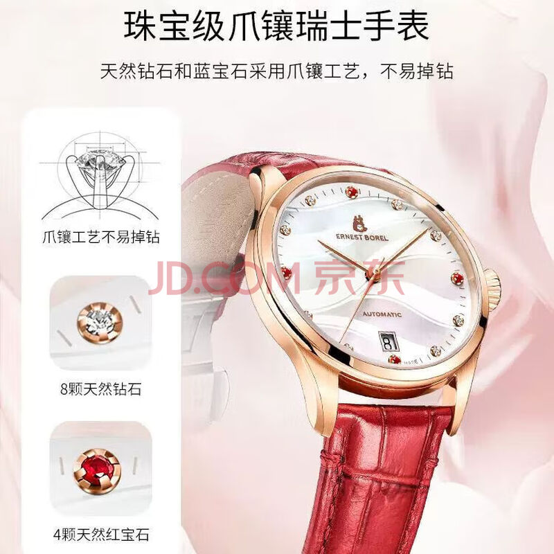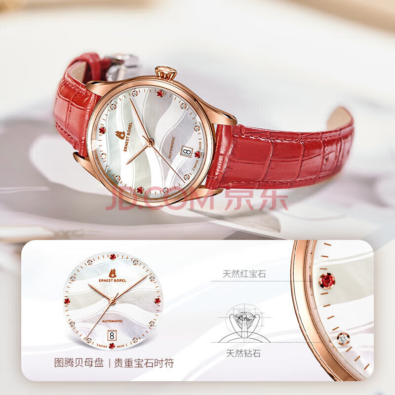 商品相册:依波路(ERNEST BOREL)瑞士女士手表 女神礼物 镶钻蝴蝶花红皮带机械女表送老婆送女友第