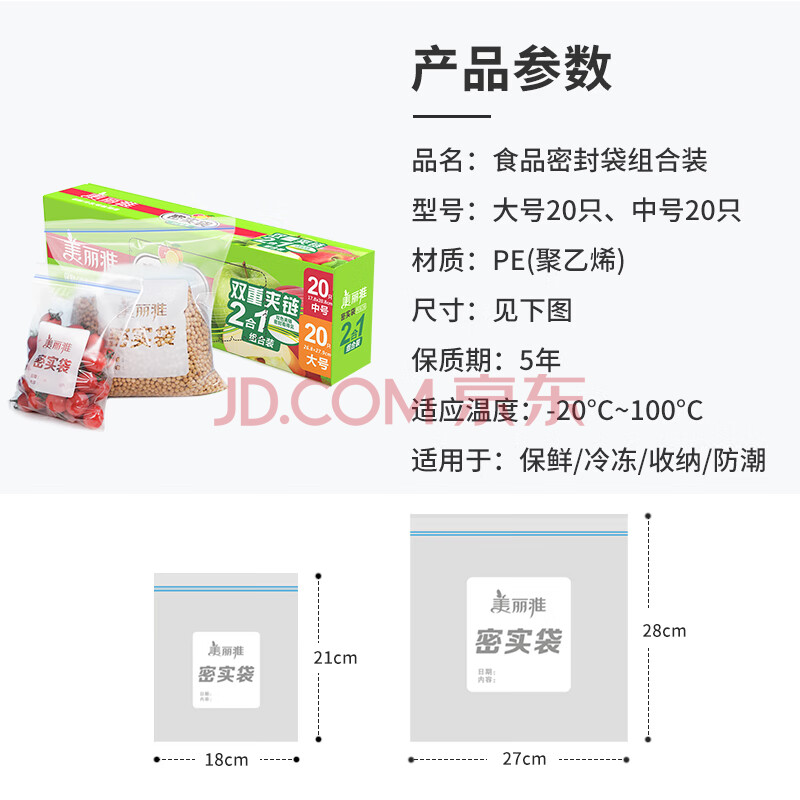 商品相册:美丽雅 食品密封袋大中号组合40只 加厚一次性冰箱分装保鲜透明自封袋子第
