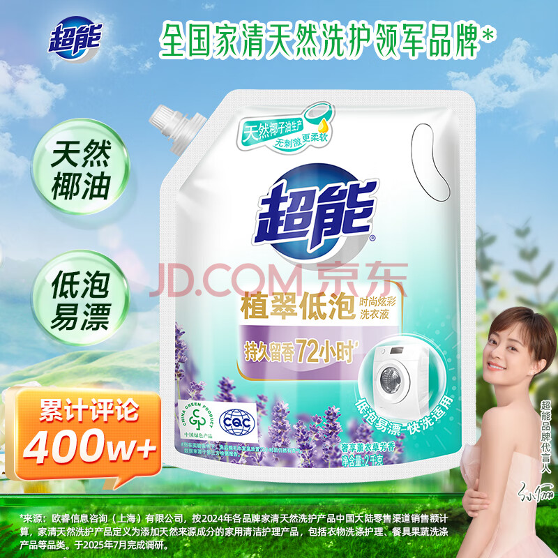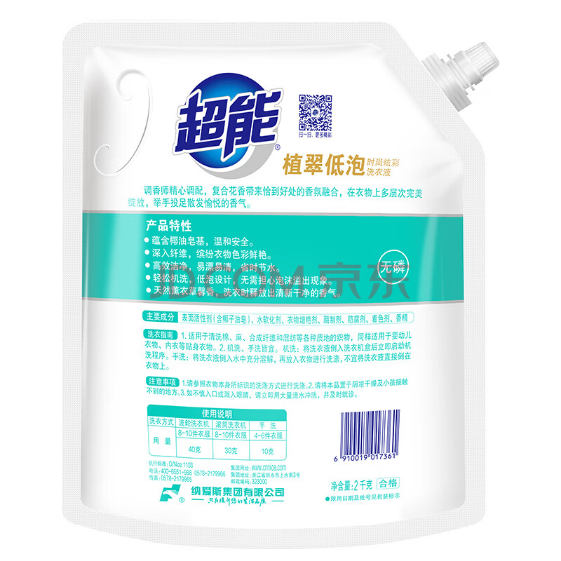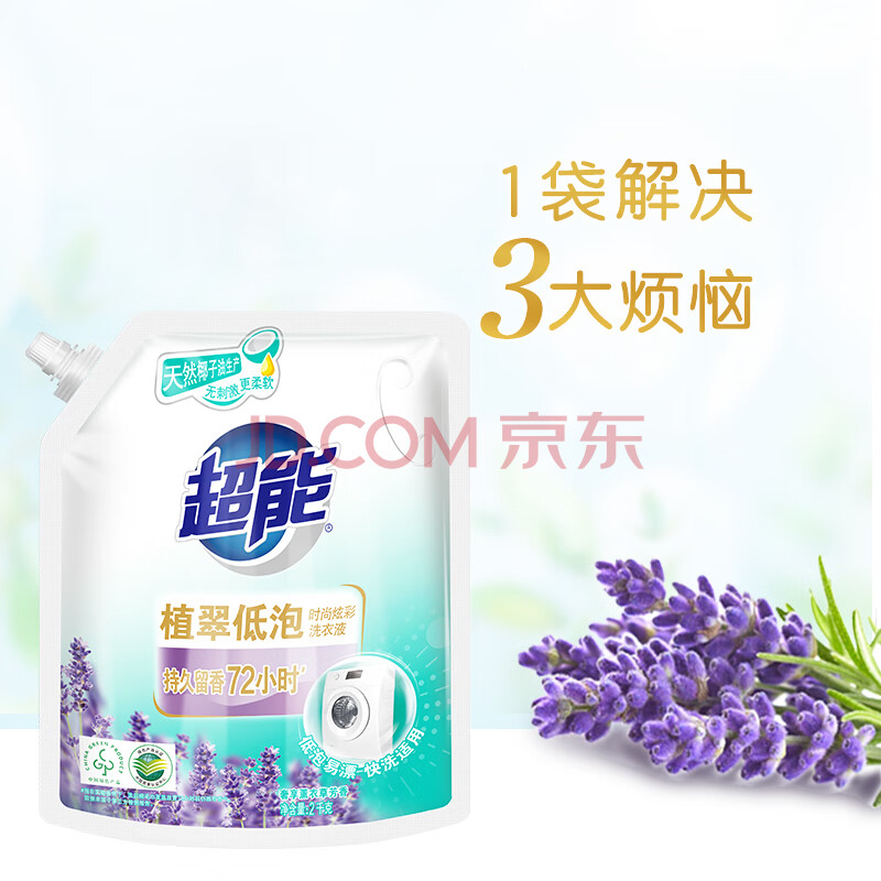 商品相册:超能 植翠洗衣液(时尚炫彩) 薰衣草香 2kg*1袋 天然椰油 低泡易漂第