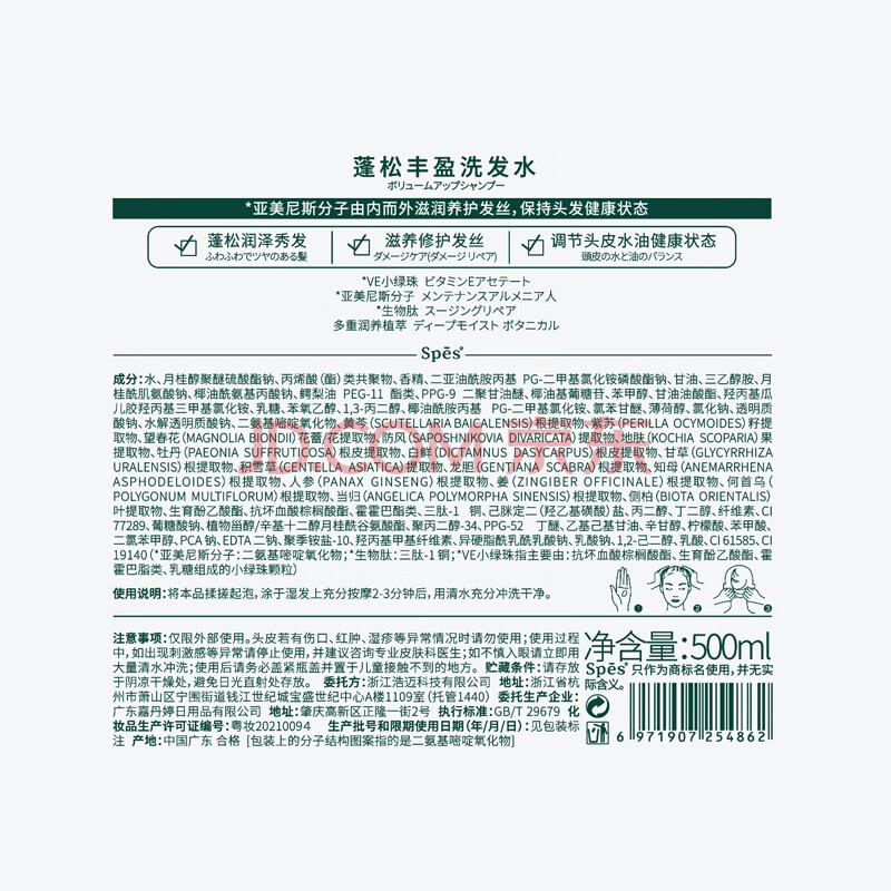 商品相册:Spes诗裴丝控油蓬松显脸小发丝补水男女士无硅油氨基酸洗护套500ml*2第