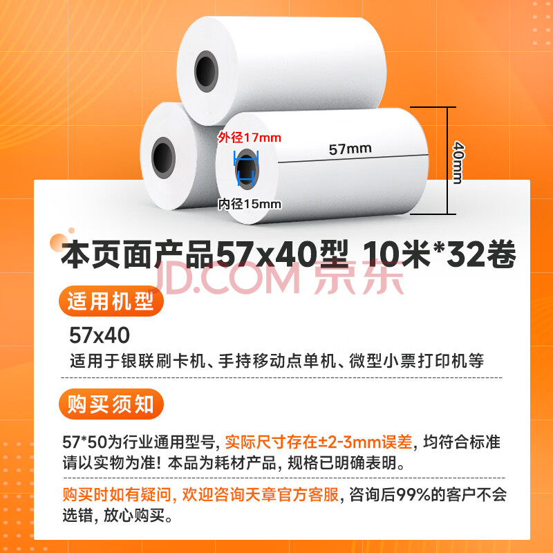 商品相册:天章 (TANGO)57*40mm10米*32卷 新橙天章热敏收银纸 京东美团外卖餐饮小票纸 银行大厅凭证打印纸 适配58mm机器第