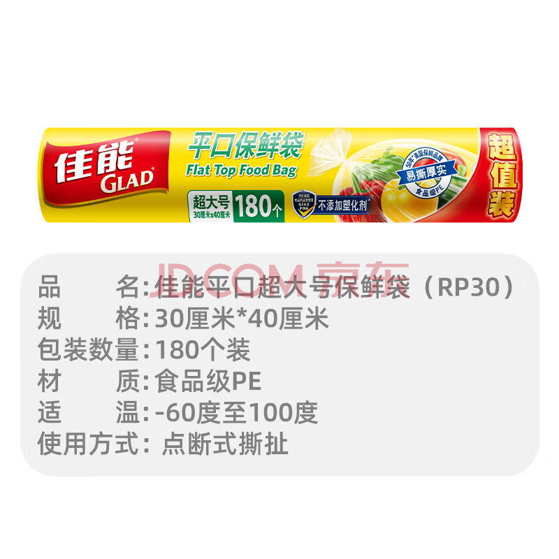 商品相册:佳能(Glad)食品级保鲜袋超大号180个 平口点断式食品袋 生鲜蔬果保鲜第