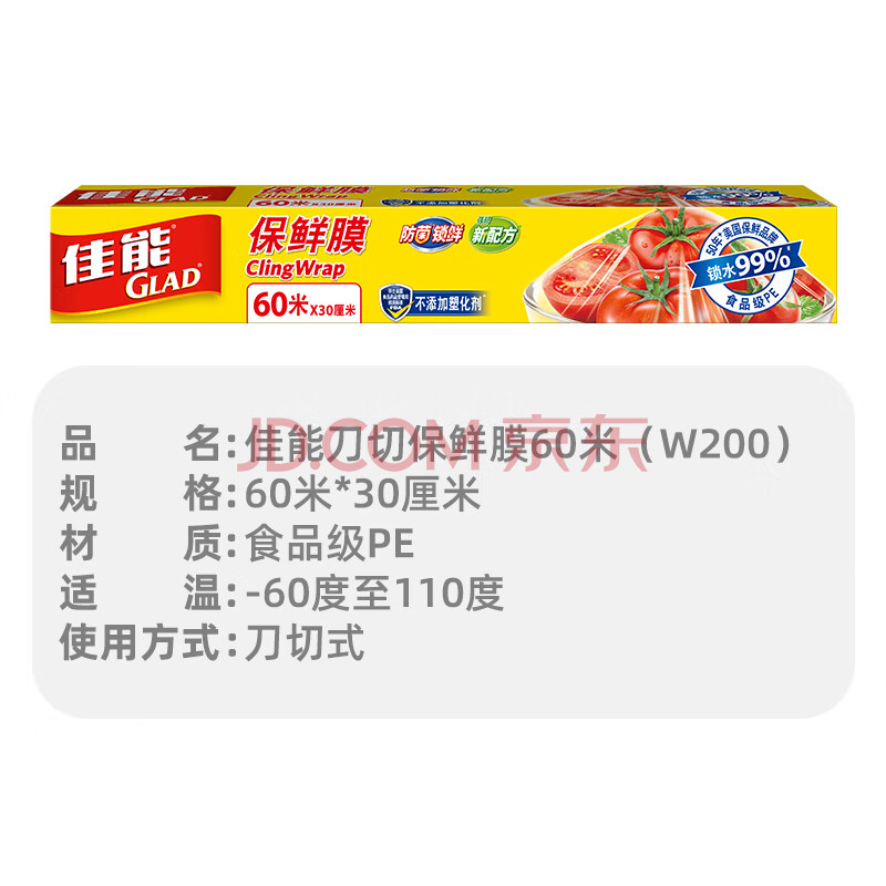 商品相册:佳能(Glad)食品级保鲜膜60米 自带切割器 家用保鲜膜套30cm宽大号 W200第