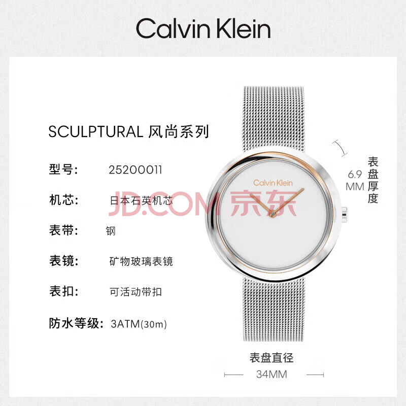 商品相册:Calvin KleinCK手表小圆盘钢带石英女表女神节新年礼物女25200011第