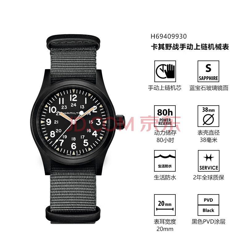 商品相册:汉米尔顿(Hamilton)汉密尔顿卡其野战手动上链机械表38黑盘瑞士手表军表男款手表礼物第