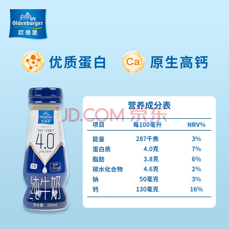 商品相册:欧德堡(Oldenburger)4.0g蛋白高钙 全脂纯牛奶200ml*24盒 京东自营 早餐奶第