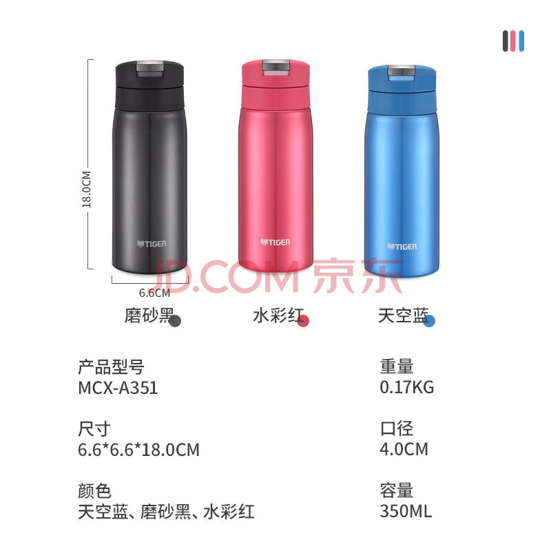 商品相册:虎牌(TIGER)梦重力轻巧弹盖保温保冷真空户外水杯MCX-A351-KMT磨砂黑色350ml第