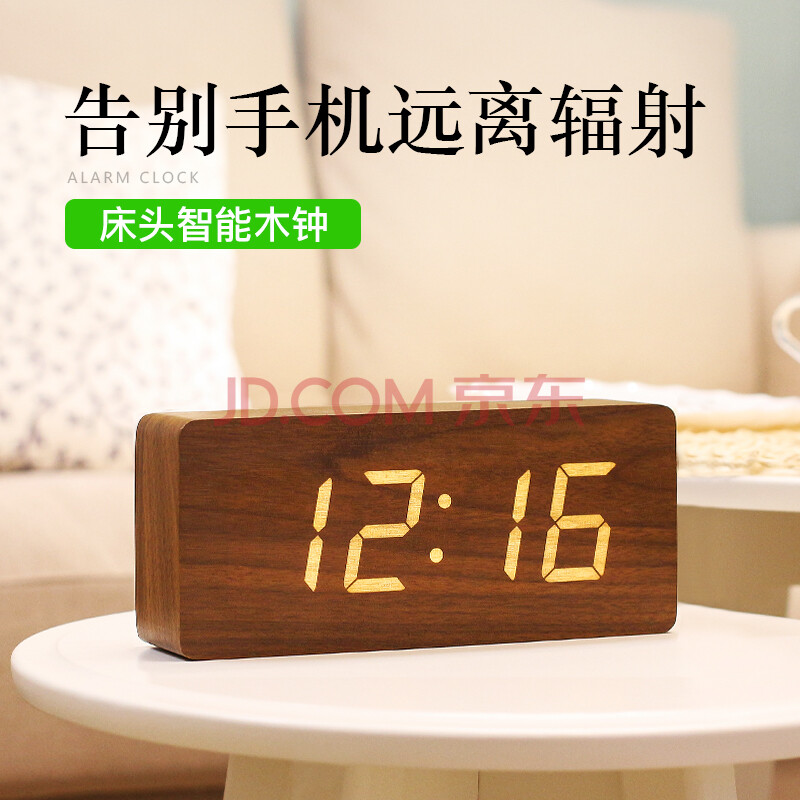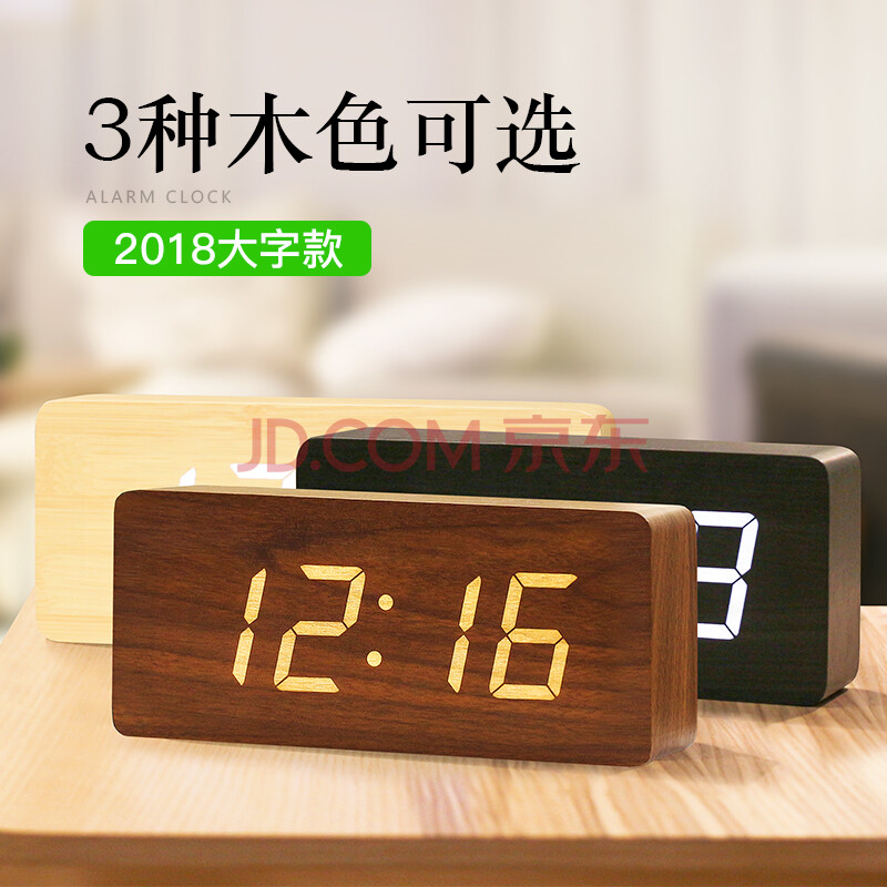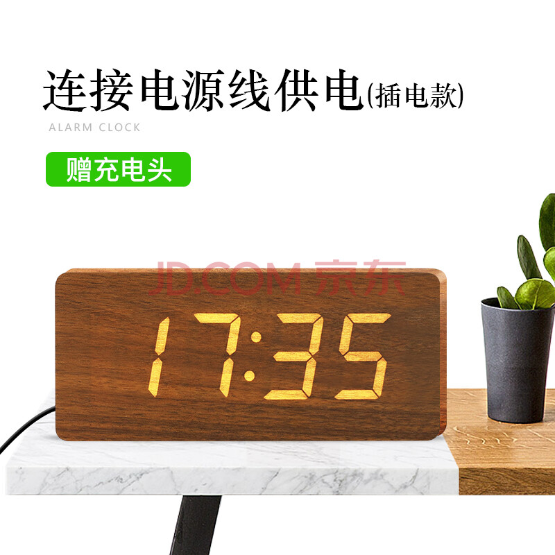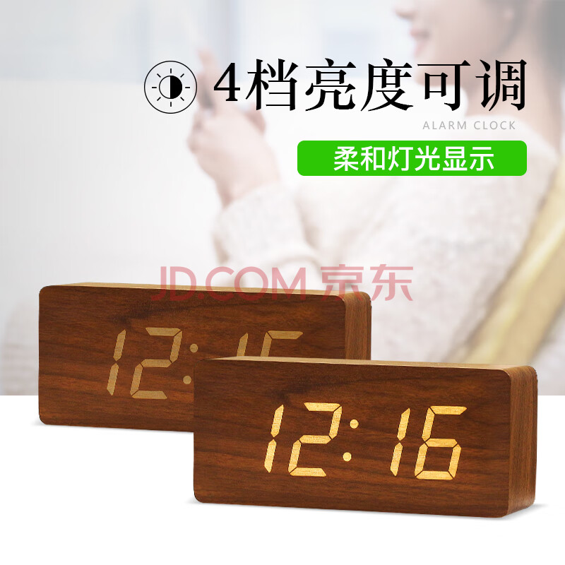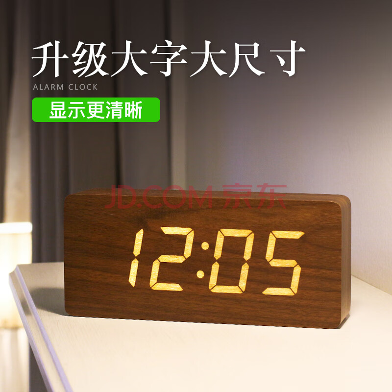 商品相册:码仕 闹钟创意大字体电子钟智能LED夜光儿童学生充电小闹钟木头床头钟DP-03棕木白显plus插电款开学季第