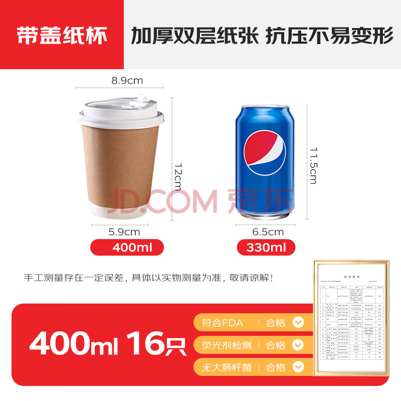 商品相册:全适带盖杯子果汁奶茶豆浆热饮杯400ml16个装饮料杯一次性纸杯咖啡杯第