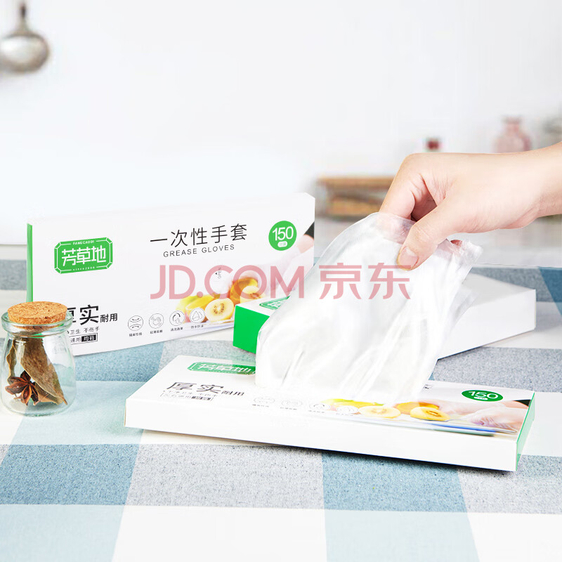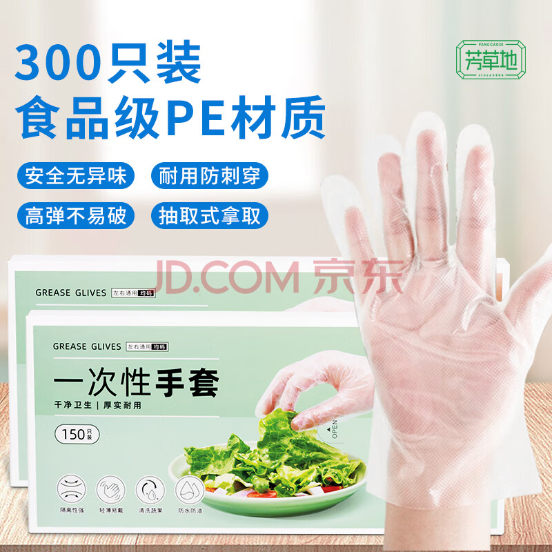 商品相册:芳草地一次性手套300只 盒装抽取式食品用pe手套 美发户外烧烤烘焙加工第