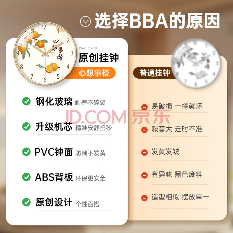 商品相册:BBA挂钟新中式心想事橙客厅书房卧室餐厅家用创意钟表时钟30cm第