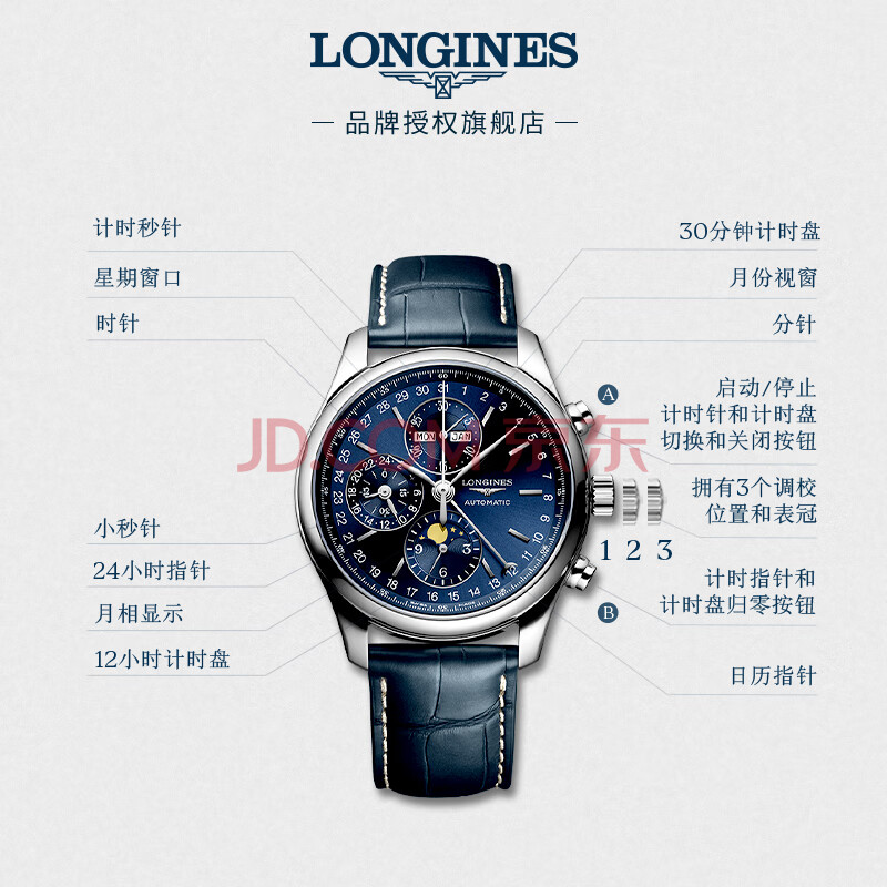 商品相册:浪琴(LONGINES)瑞士手表 名匠系列计时码表 月相男士皮带机械表 L27734920第