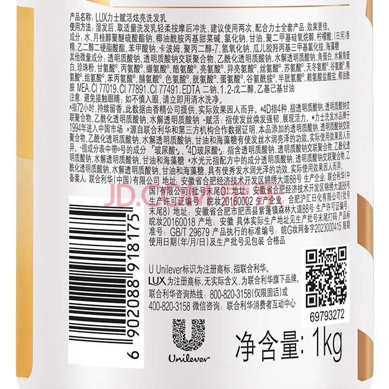 商品相册:力士(LUX)玻尿酸赋活炫亮强韧洗发水1kg 受损暗哑发质 水光瓶留香洗发露第