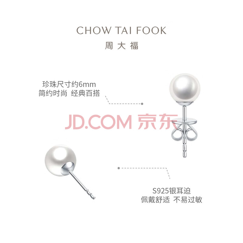 商品相册:周大福简约时尚 925银镶珍珠耳钉 AQ32849 直径约5.95mm生日礼物第