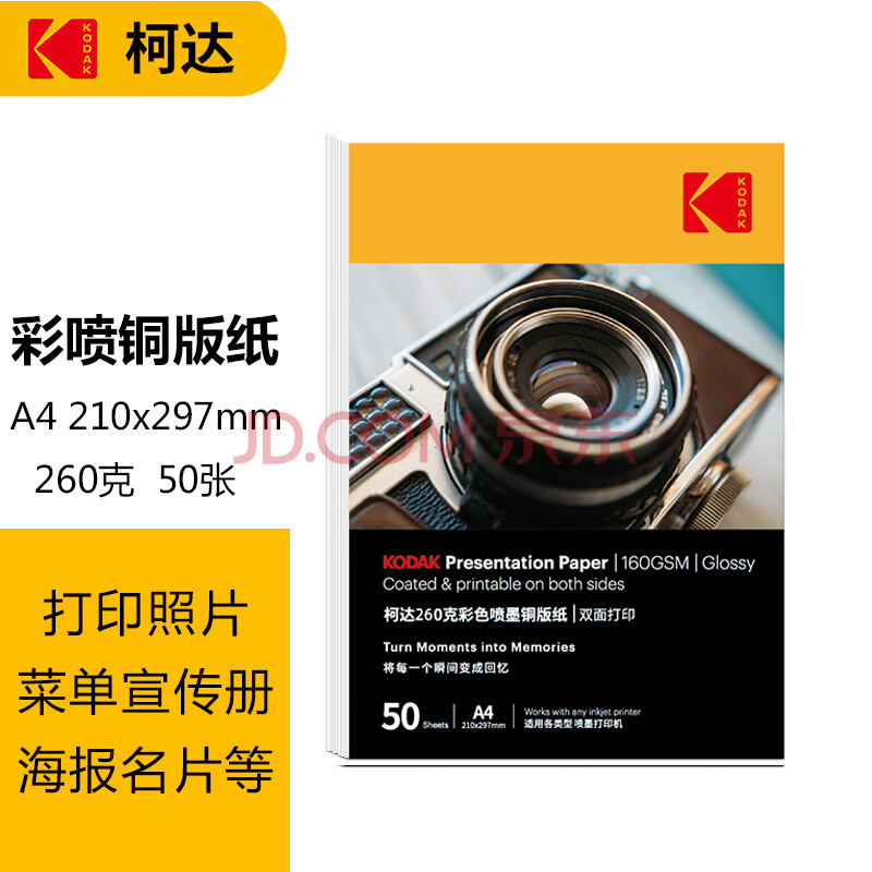 商品相册:KODAK柯达彩色喷墨铜版纸260g/A4高光相纸双面照片纸相片纸名片纸封面广告打印纸 50张装9891-350第1张/共6