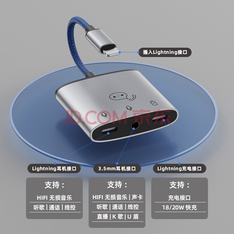 商品相册:得语 苹果耳机转接头三合一充电听歌iPhone14 11 12pro 13 XS XR音频转换器分线器直播声卡游戏吃鸡语音连麦第