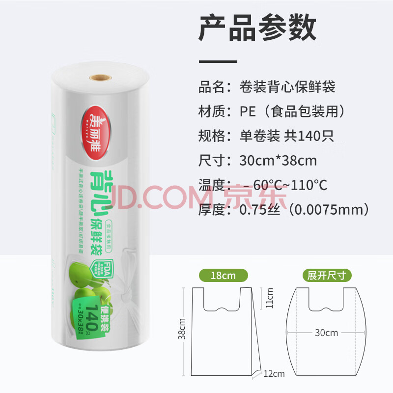 商品相册:美丽雅一次性保鲜袋背心式中号 食品级140只38*30cm冷藏分装塑料袋子第