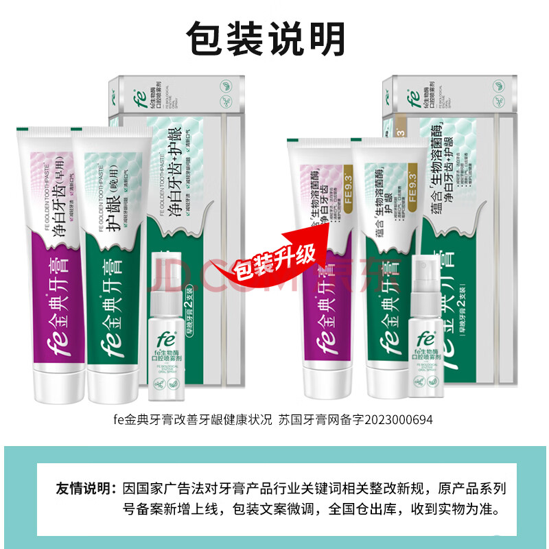 商品相册:fe金典牙膏清新口气留兰味薄荷冰橙净白护牙生物酶9.3共250g和15ml口喷第
