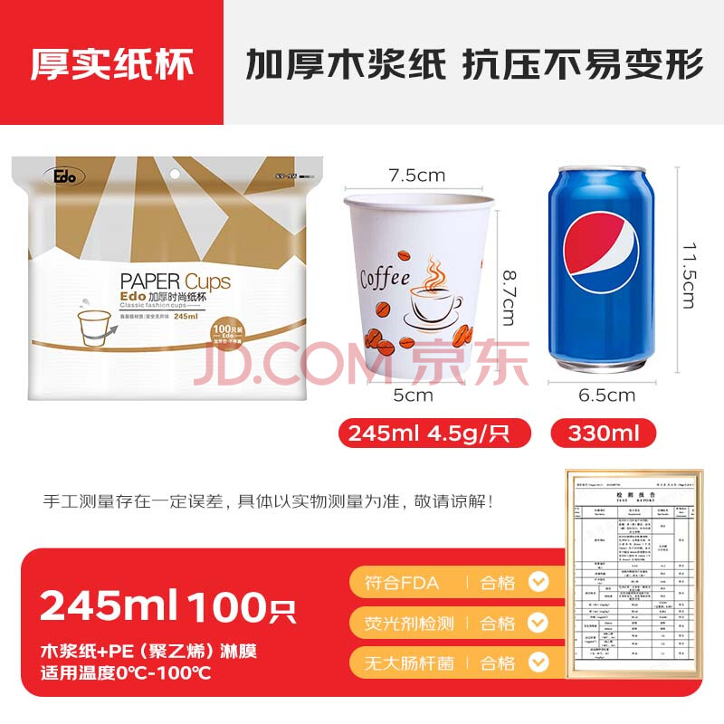 商品相册:庭好 一次性纸杯100只装 喝水杯子加厚咖啡杯奶茶杯 245毫升 TH7526第