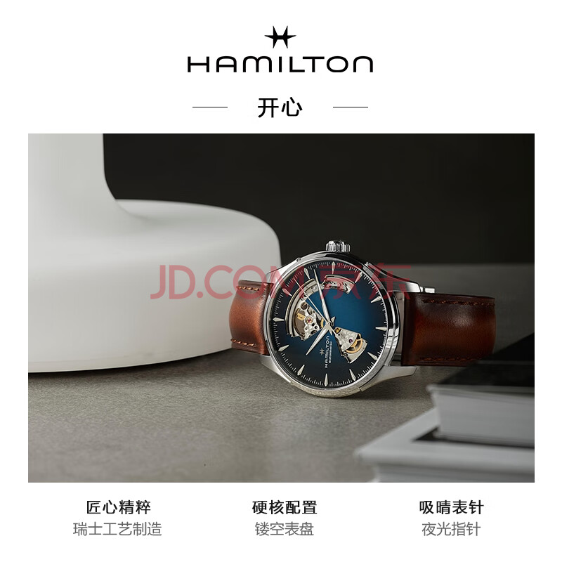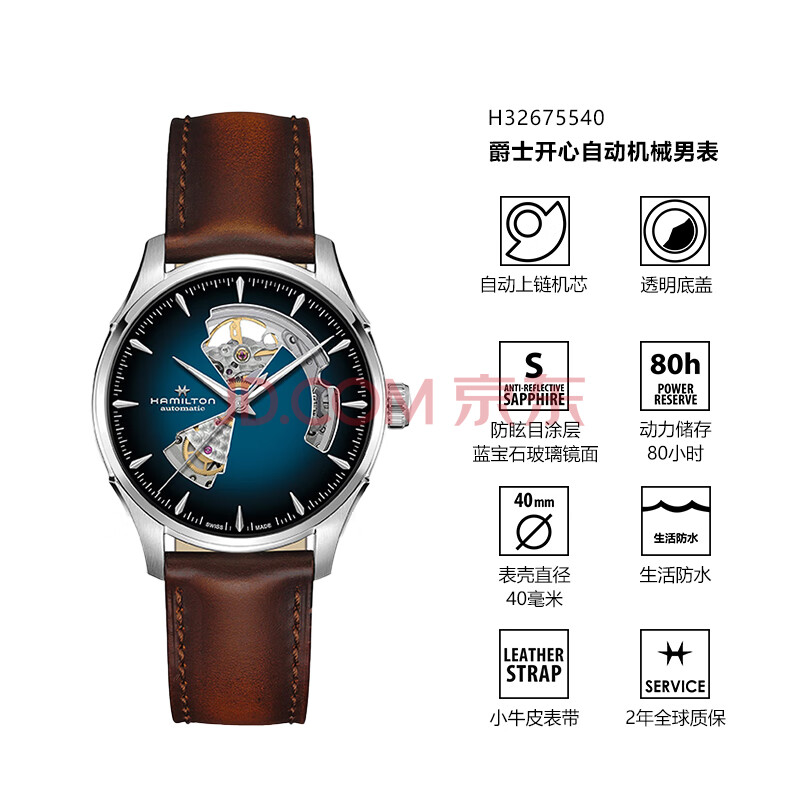 商品相册:汉米尔顿(Hamilton)汉密尔顿男士手表爵士开心系列镂空机械表40蓝盘皮带瑞士表商务表第