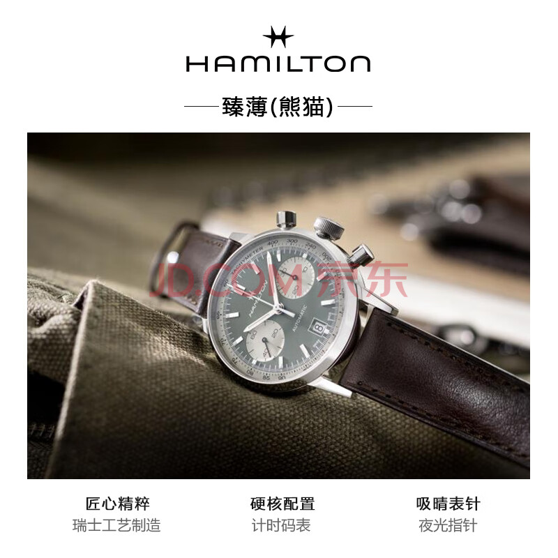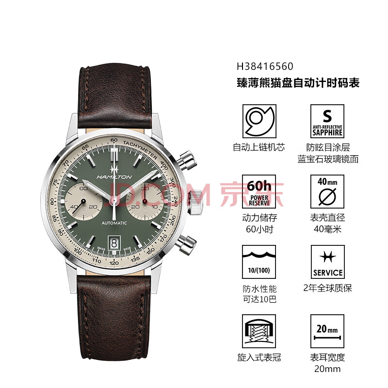 商品相册:汉米尔顿(Hamilton)经典臻薄熊猫盘计时码表40绿盘皮带男士手表瑞士机械表商务表第