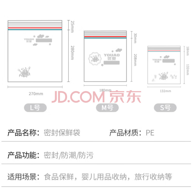 商品相册:优奥密封袋小号60只透明PE保鲜袋食品收纳袋厨房冰箱自封袋密实袋第
