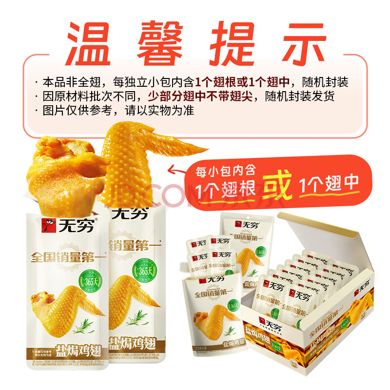 商品相册:无穷盐焗鸡中翅休闲零食小吃熟食即食鸡翅60g袋装共4独立小包第
