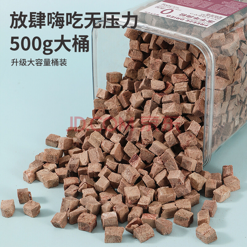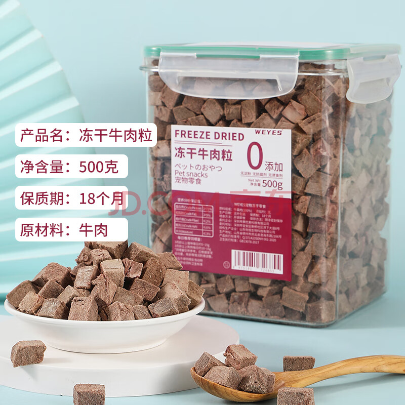 商品相册:WEYES冻干牛肉粒500g桶装猫狗宠物零食营养酥脆高蛋白牛肉干第