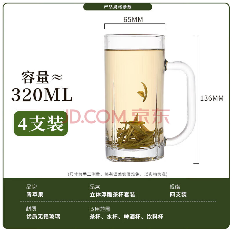 商品相册:青苹果带把水杯茶杯 扎啤杯啤酒杯 无铅玻璃杯可乐杯饮料杯4只装320ml第