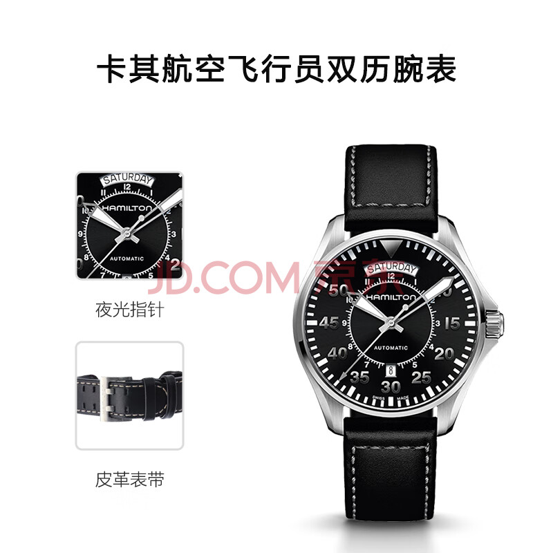 商品相册:汉米尔顿(Hamilton)汉密尔顿卡其航空飞行员双历42黑盘皮带瑞士手表男士机械表礼物第