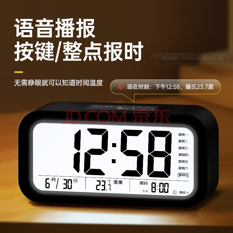 商品相册:BBA闹钟 充电款大音量智能温度电子闹铃2026新款儿童学生专用起床神器桌面时钟开学必备 黑色语音报时第