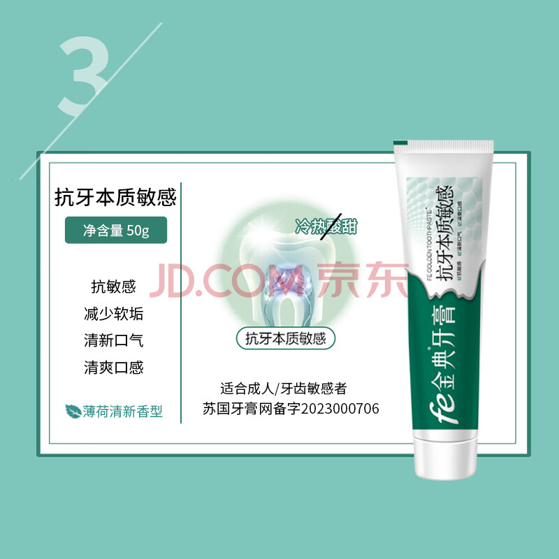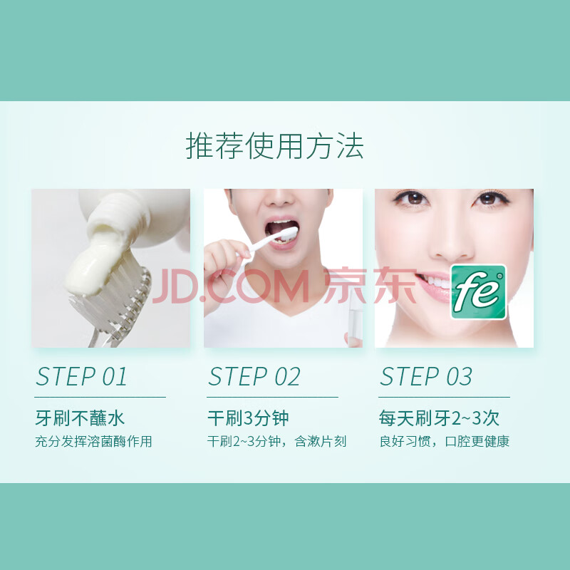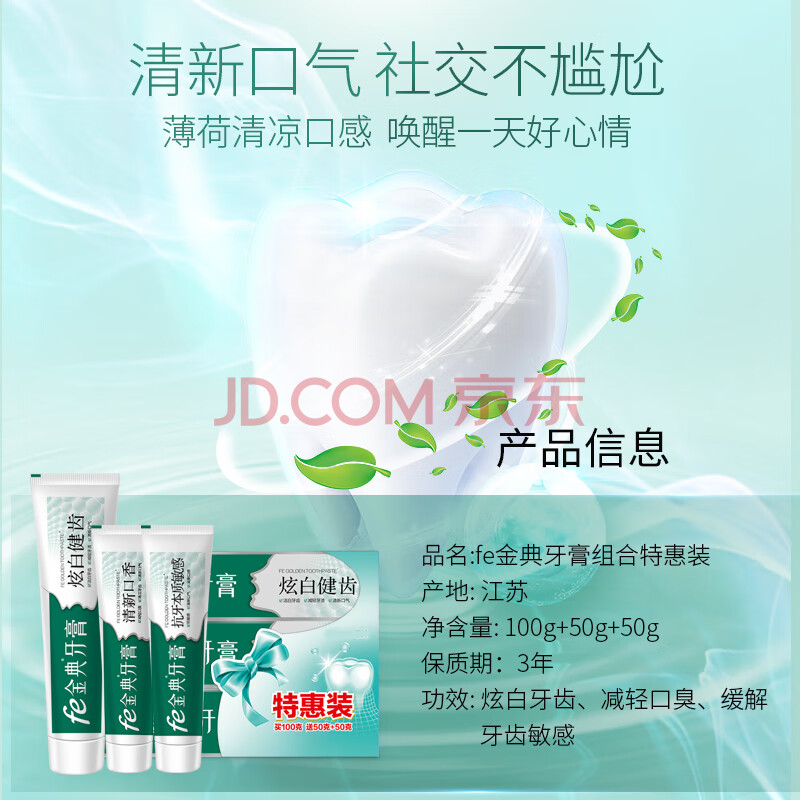 商品相册:fe金典生物酶牙膏9.3促销装3小支 炫白健齿100g抗敏50g清新口气50g第