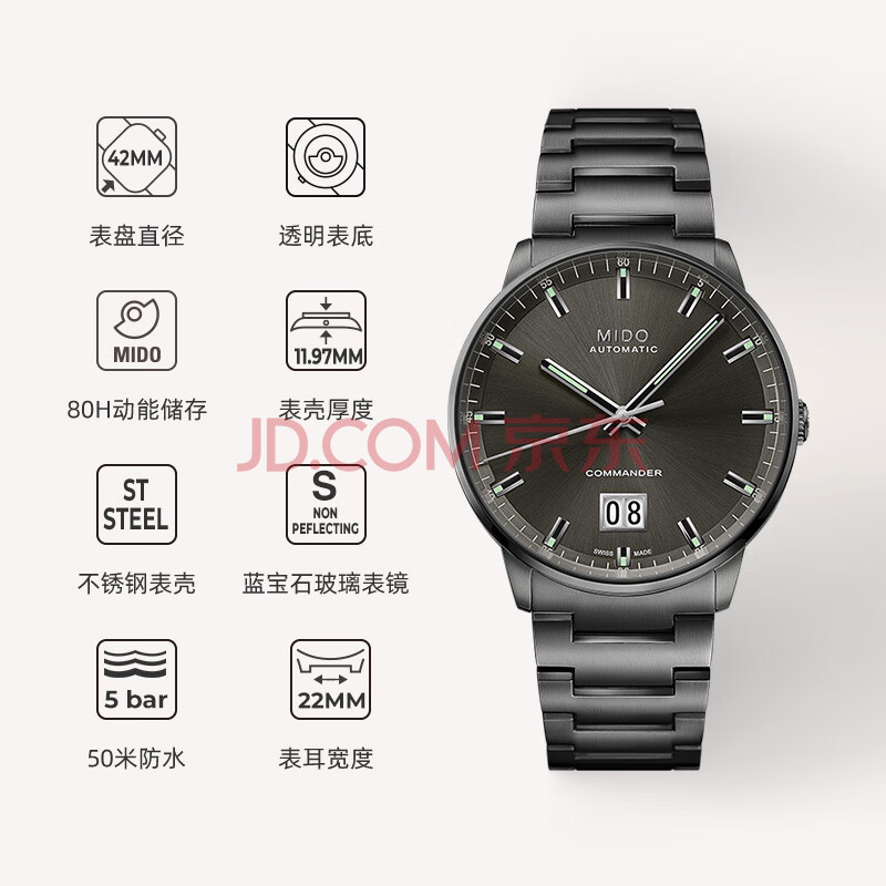 商品相册:美度(MIDO)瑞士手表 指挥官系列 纪念款 长动能 商务休闲 机械钢带男表第