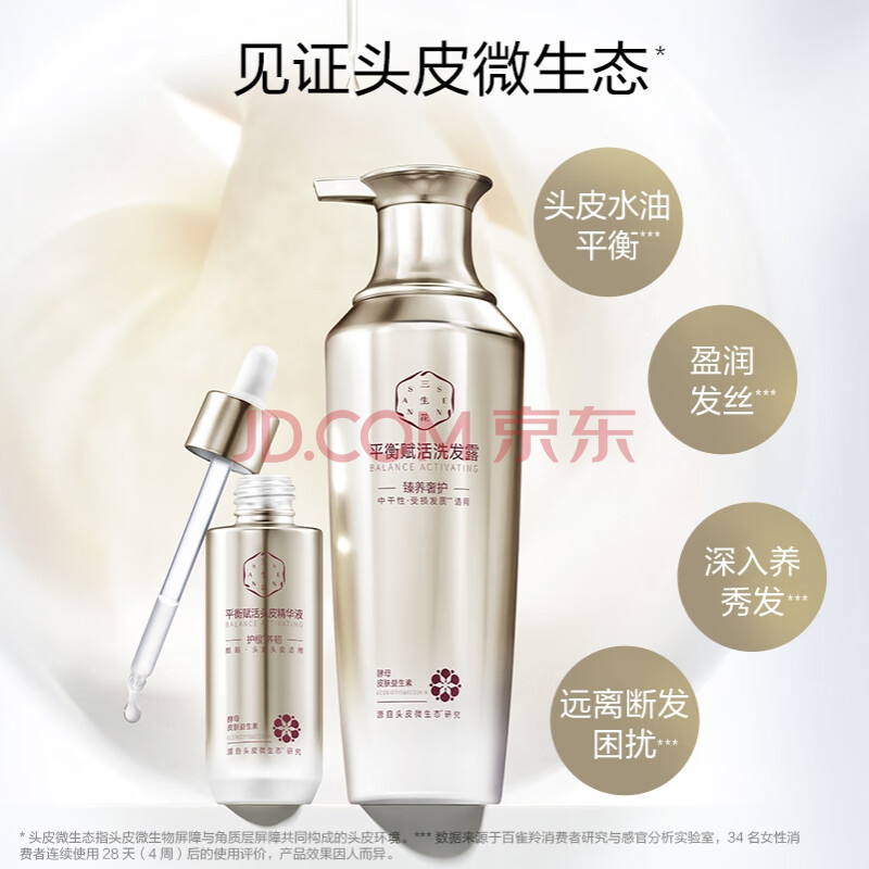 商品相册:三生花百雀羚出品平衡赋活柔顺滋养控油去屑洗发露(清盈净屑)400ml第