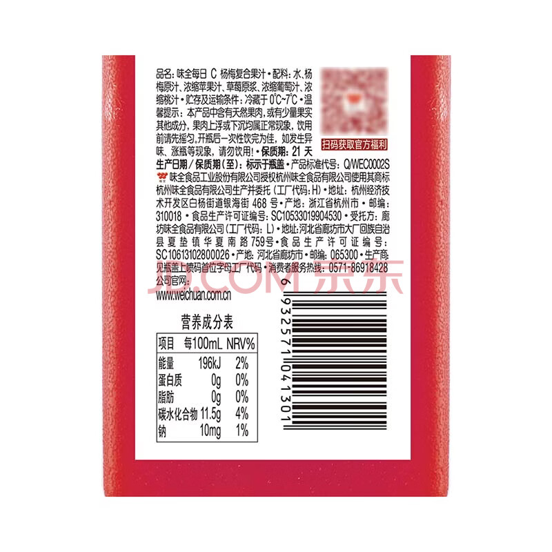 商品相册:味全每日C杨梅汁 100%果汁冷藏果蔬汁饮料900ml*1瓶第