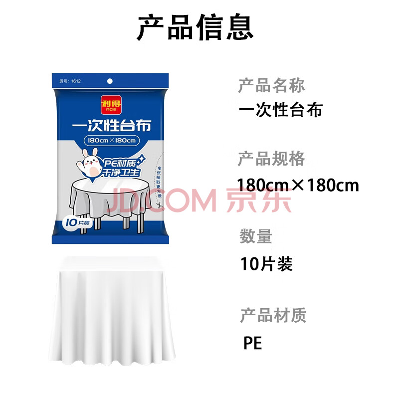 商品相册:利得一次性桌布增厚白色台布180cm*180cm*10张厚实不易破防水防油第