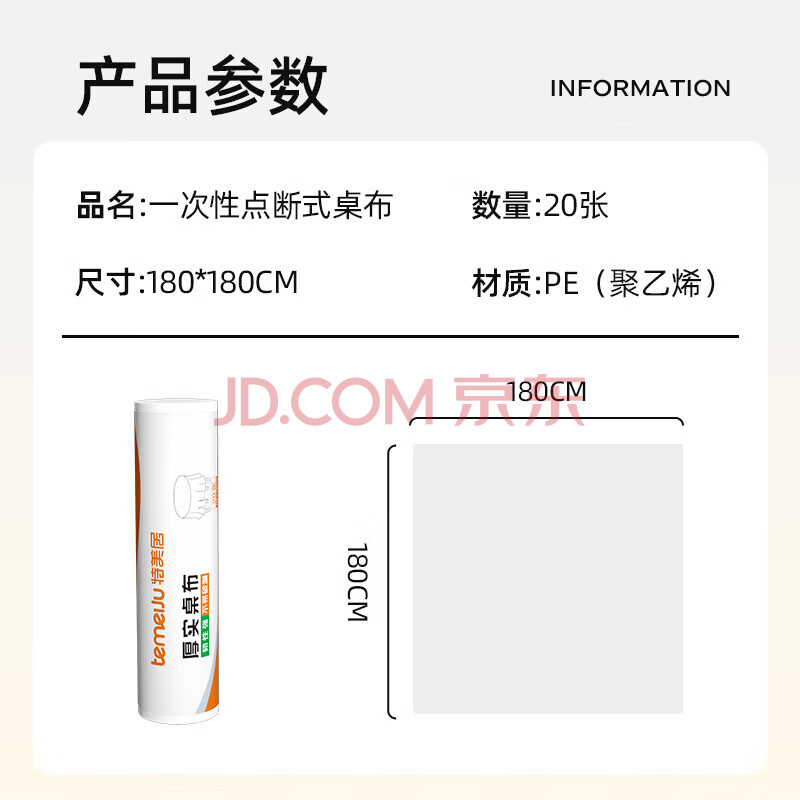 商品相册:特美居(temeiju)一次性桌布长方形加厚餐垫桌膜台布防水防油加大号180*180cm*20张第